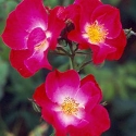 Hybrid Musk. A tall growing summer flowering rose with trusses of single blooms that are a vivid red tone fading to pale white in the centre and highlighted by golden stamens. Very fragrant with dark green foliage. Bred in Germany in 1933. This rose would be very suitable to use as hedging.