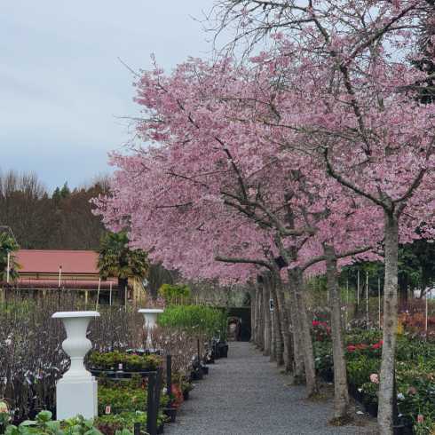 Prunus Awanui starting to flower. As a plant which was bred in the Taranaki it has been enthusiastically adopted by many in the Waikato, including a couple of avenues at our nursery. As a medium growing, well shaped and spectacular flowering tree it is an excellent choice for driveways or gardens.