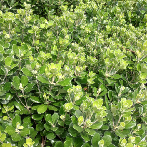 Karo is the best example of this. If you know it, you will be familiar with the seed pods which open, after the purple flowers have finished, to reveal seeds covered in gooey black stuff. Perfect for coastal conditions, the leathery grey green leaves of this one are hardy to dry, salty or windy conditions making it a great windbreak or screening plant. We currently have in stock a hybrid form called